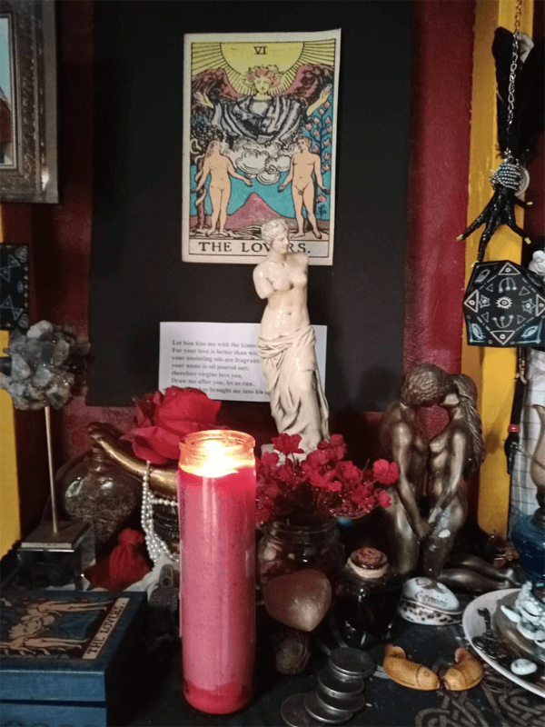 $110.00 Love can be both life’s greatest blessing and its greatest curse. It is little wonder that love work is by far the most requested service at Divine Harmony Spiritual Church. The Garden of Venus is a section of the main chapel that is dedicated for work attracting lovers, soothing problems in relationships, rekindling passion in relationships that have gone cold, and for reconciliation. This altar calls upon the Goddess Venus to bring her influence into matters of love, beauty, desire, sex, fertility, friendship, sympathy, self-love, increased excellence in artistry, establishing healthy plants, and increasing aesthetic beauty. She is often associated with the Greek goddess Aphrodite and was said to be the loveliest of all deities. A statue of Venus, which Rev. Saint Germain's mother claimed was gifted to her by legendary Knoxville Madame Hazel Davidson, is the centerpoint of the altar. Also included is a very rare bronze statue entitled Lover Prelude by noted Spanish sculptor Manuel Vidal who specialized in erotic imagery, images of Adam & Eve and The Lovers from the Major Arcana tarot, a naturally occuring heart shaped piece of quartz, a box containing matched lode stones for attraction, a large amethyst cluster which is believed to help transform negative energy into a more positive form which is useful to turn around troubled relationships, foster forgiveness, and aid in reconciliation. When you call upon the Goddess Venus, you gain a powerful ally in navigating love's choppy waters. |