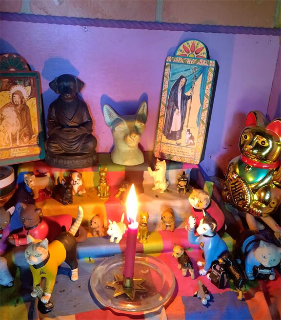 The Divine Harmony Pet Shrine is an altar at Divine Harmony Spiritual Church that is devoted to calling upon Saint Gertrude, the patron saint of cats, Saint Rocco, the patron saint of dogs, and Julian of Norwich, to watch over, protect, and heal our animal friends or animal lovers who are facing difficulties.
